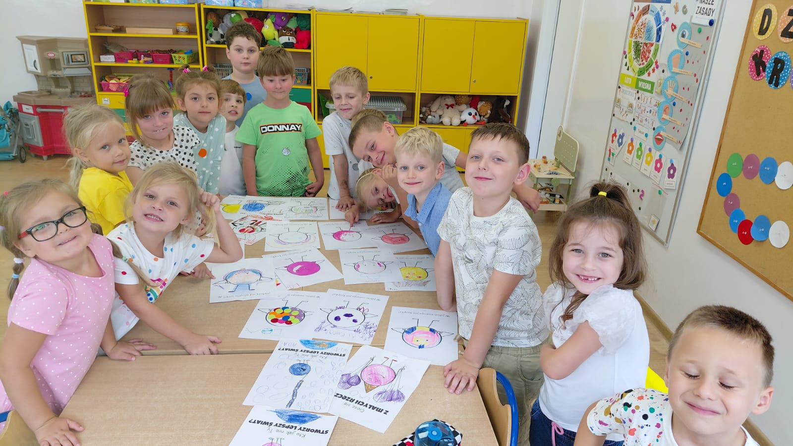 Dzieci poznały historię Vashti, rozmawiały o znaczeniu kropek i tworzyły własne "kropkowe" dzieła. Powstała kolorowa gąsienica na gazetce, nie zabrakło też wesołych kropek na ubraniach oraz kolorowanek pełnych barw i emocji. To był dzień pełen uśmiechu i twórczej radości!