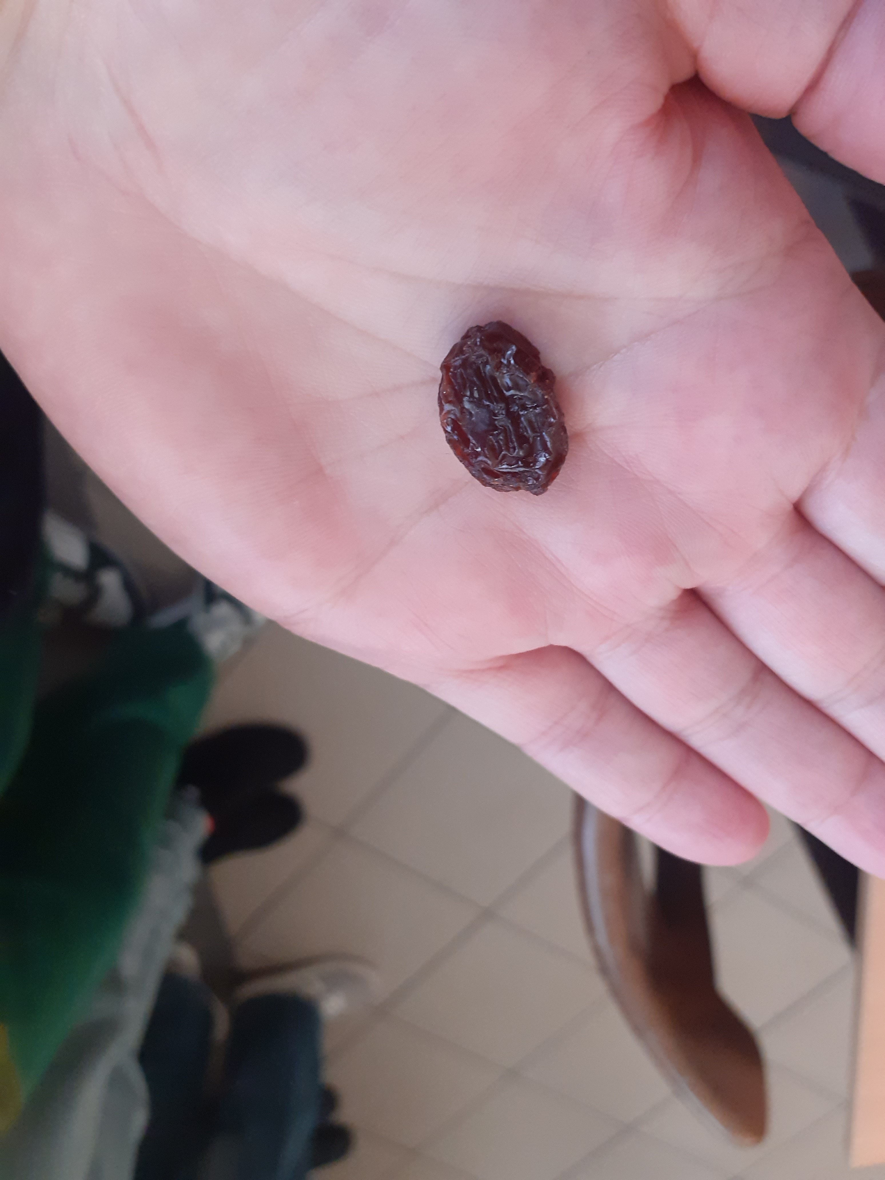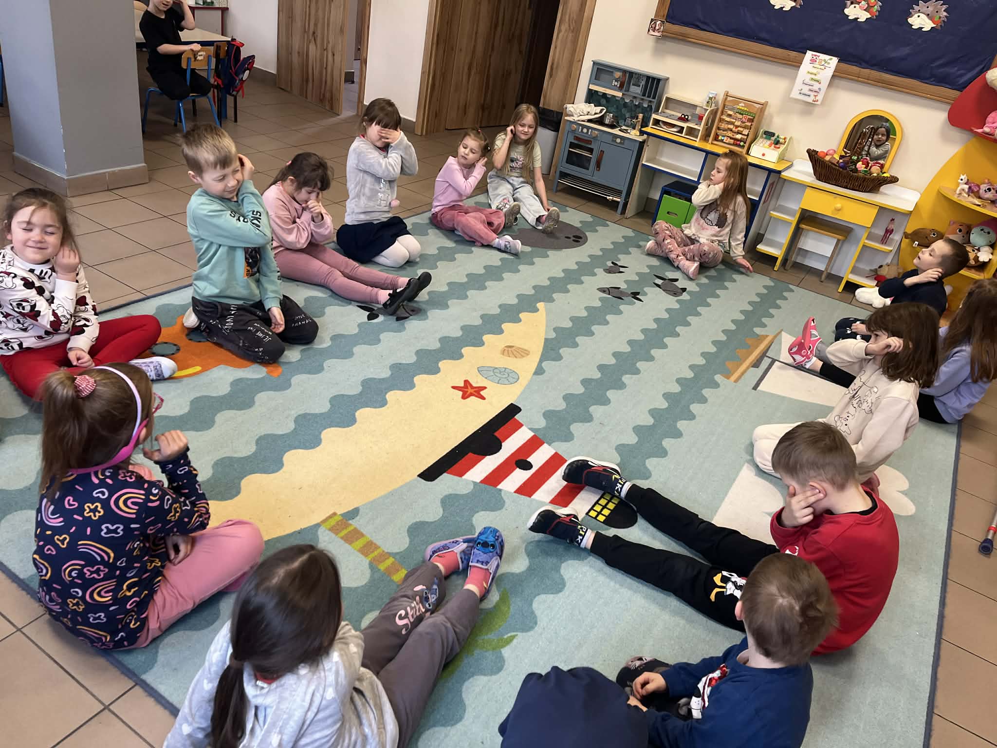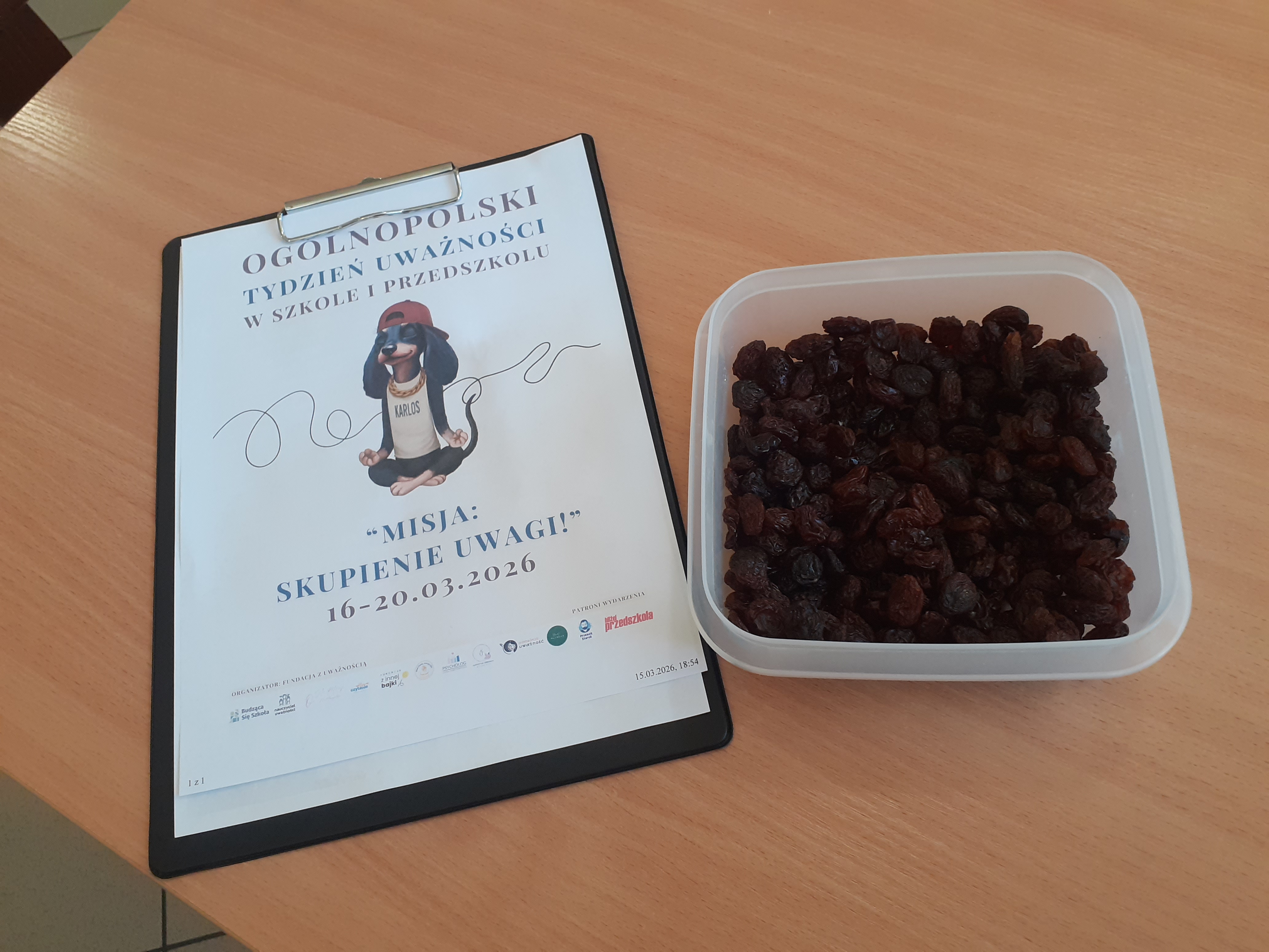 Uważność obejmowała także codzienne szkolne nawyki. Zwracaliśmy uwagę na przygotowanie do zajęć – uczniowie uczyli się, jak świadomie organizować swoje rzeczy, aby mieć przy sobie wszystko, co potrzebne podczas lekcji. Była to okazja do kształtowania odpowiedzialności i lepszej organizacji w codziennym funkcjonowaniu. Szczególnym doświadczeniem było wspólne ćwiczenie „Rodzynkowa wyspa”, zaczerpnięte z programu „Apteczka pierwszej pomocy emocjonalnej”, w którym udział wzięli zarówno uczniowie, jak i nauczyciele. Podczas tego zadania uczestnicy mieli okazję w pełni skupić się na jednej, prostej czynności – uważnym poznawaniu rodzynki wszystkimi zmysłami. Ćwiczenie to pokazało, jak wiele możemy dostrzec, kiedy naprawdę się zatrzymamy i skierujemy uwagę na „tu i teraz".