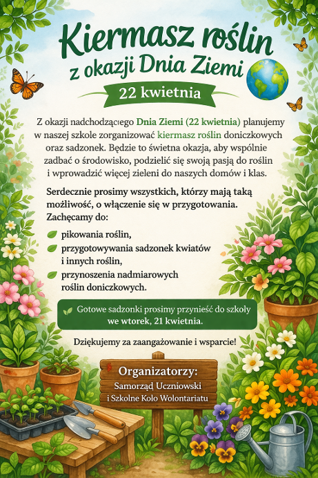 Z okazji zbliżającego się Dnia Ziemi zapraszamy wszystkich uczniów, rodziców oraz pracowników szkoły do udziału w akcji! |